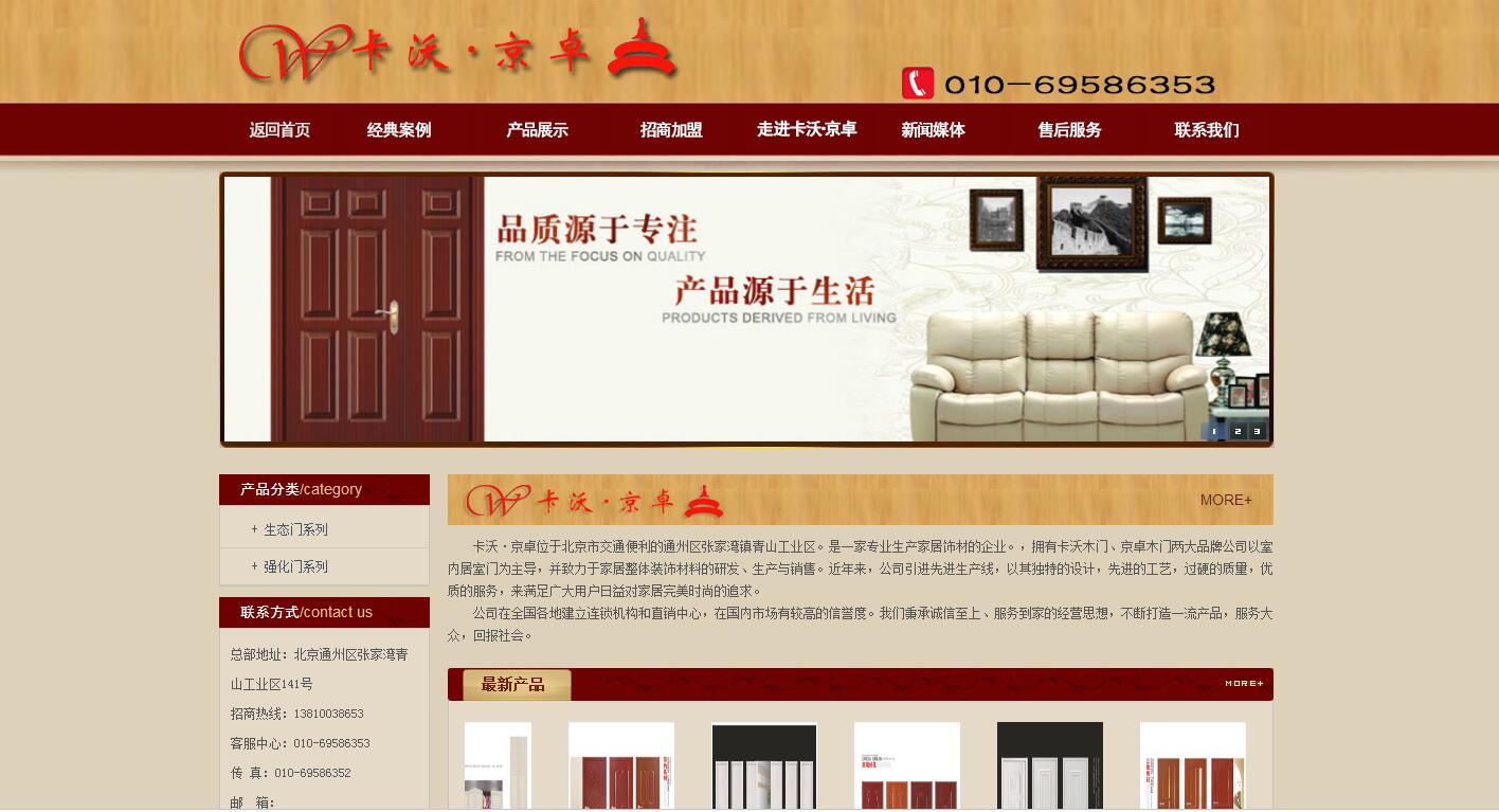 卡沃·京卓位于北京市交通便利的通州區(qū)張家灣鎮(zhèn)青山工業(yè)區(qū)。是一家專業(yè)生產(chǎn)家居飾材的企業(yè)。,擁有卡沃木門、京卓木門兩大品牌公司以室內(nèi)居室門為主導(dǎo),并致力于家居整體裝飾材料的研發(fā)、生產(chǎn)與銷售。近年來(lái),公司引進(jìn)先進(jìn)生產(chǎn)線,以其獨(dú)特的設(shè)計(jì),先進(jìn)的工藝,過硬的質(zhì)量,優(yōu)質(zhì)的服務(wù),來(lái)滿足廣大用戶日益對(duì)家居完美的追求。